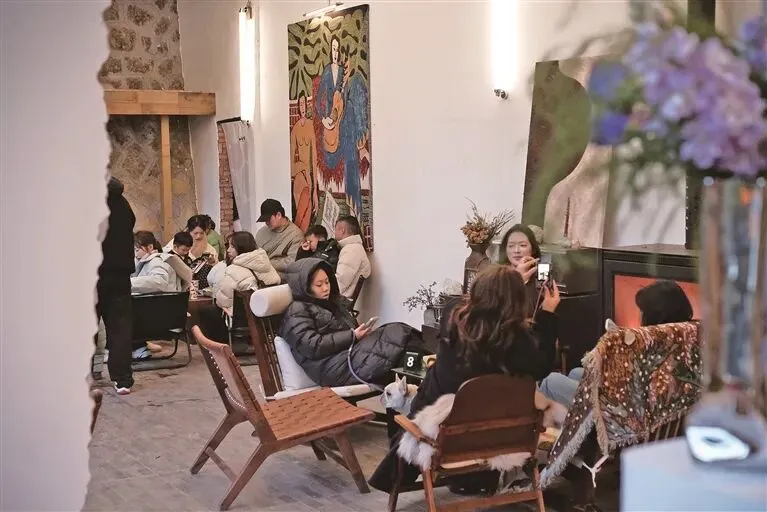 从测量尺寸、手绘图纸到选材装修,桥洞咖啡屋的每一处细节都由夫妻俩亲手打磨。店内陈设皆是巧思:古旧立柜静静伫立,简约的木质桌椅错落摆放,一件件老物件沉淀着时光的韵味;店内摆放的画作是黄雪琦亲手绘制,抽象的笔触与空间的质朴风格相得益彰;墙角的壁炉里炭火噼啪跳动,暖意融融,成了游客争相打卡的绝佳点位。