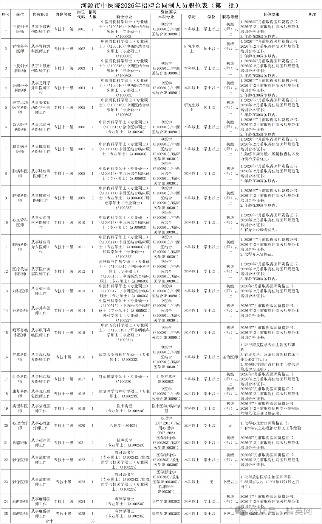 本次计划招聘33人。招聘岗位名称、岗位职责和资格条件要求详见河源市中医院2026年招聘合同制人员职位表(第一批)(附件2)。