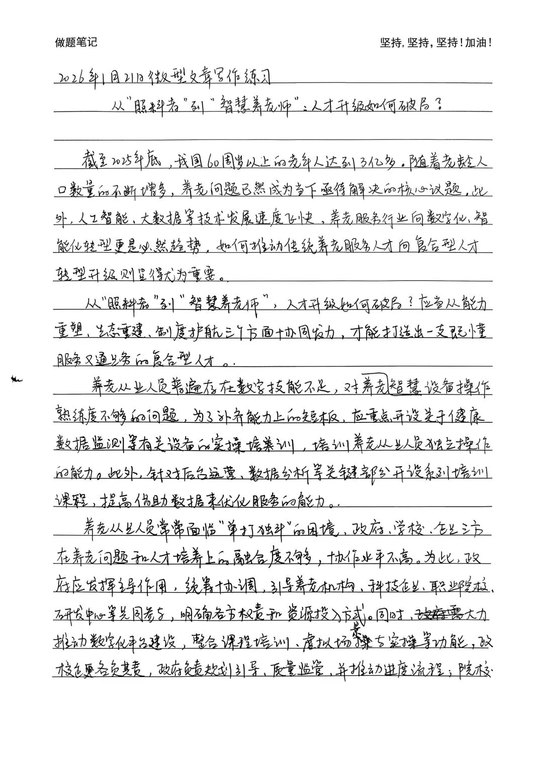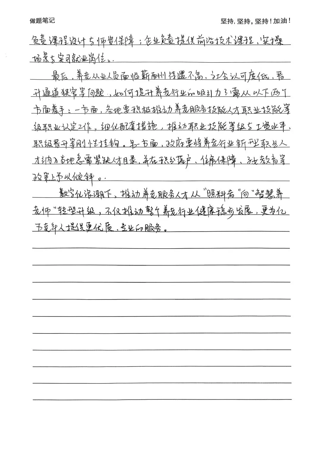 2.要让语言“有回响”:结尾的感染力不够。结尾应该要做到首尾呼应、升华主题,回扣“人才升级”如何具体地改变老年生活。这样有意识的“闭环”涉及,能够增强文章的整体感。