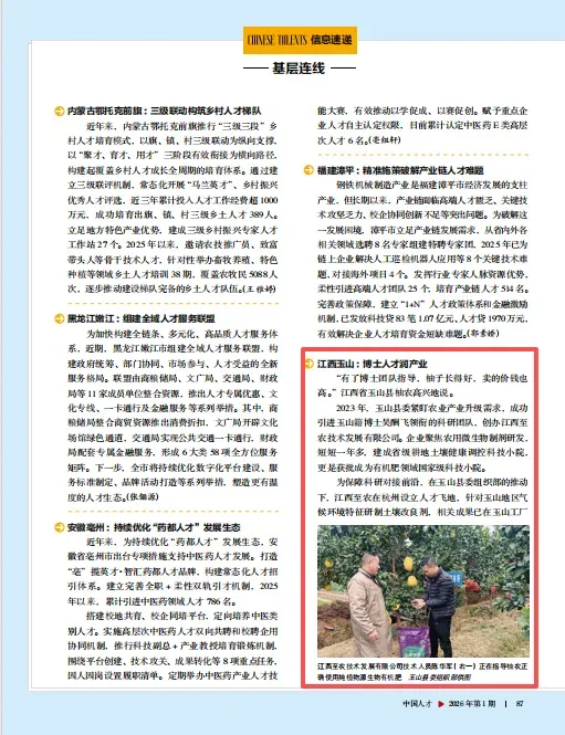 从一枚摘得全市特等奖的马家柚,到一家全国独有的有机肥国家级科技小院;从一位玉山籍博士的返乡落户,到一群硕博人才的汇聚扎根;从一家科创企业的茁壮成长,到一方农业产业的提质振兴——玉山的人才工作始终锚定“产业所需、人才所盼、未来所向”,以爱才的诚意、用才的胆识、留才的良方,让人才与乡土双向奔赴,让科技与农业深度融合。行走在玉山的田间地头,科技赋能丰收的交响正悠扬奏响,“中国博士县”的金字招牌,也在人才兴农、科技助农的实践中愈发闪亮。(记者 祝奕洁)