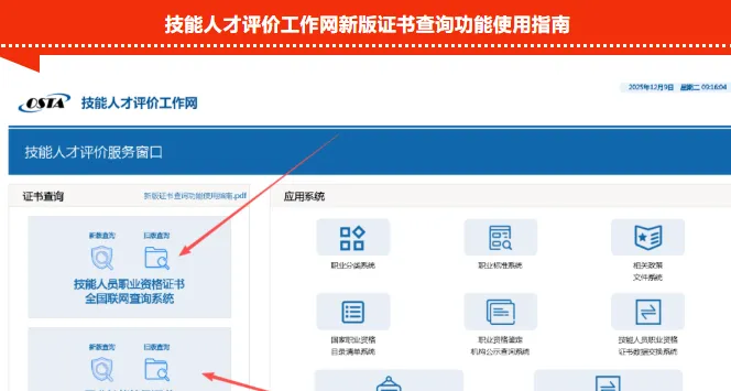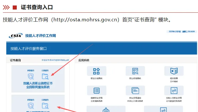 证书查询入口 技能人才评价工作网(http://osta.mohrss.gov.cn)首页“证书查询” 模块。 (技能人才评价工作网首页图示)