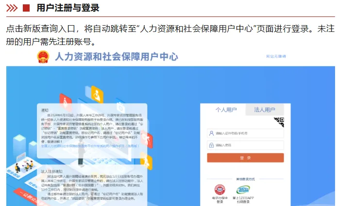 用户注册与登录 点击新版查询入口,将自动跳转至“人力资源和社会保障用户中心”页面进行登录。未注册的用户需先注册账号。 (人力资源和社会保障用户中心登录页面图示) (一)首次使用先注册账号 1、选择对应面板(个人用户 / 法人用户); 2、点击左下角 “个人注册” 或 “法人注册”; 3、按页面提示填写信息并完成实名认证; 4、注册成功后,自动跳转至登录页面。 (二)登录系统 1、输入“证件号码/手机号”及“登录密码”,点击“登录”; 2、登录成功后,自动跳转至新版查询系统(https://zscx.osta.org.cn)并维持登录状态,进入个人查询页面。