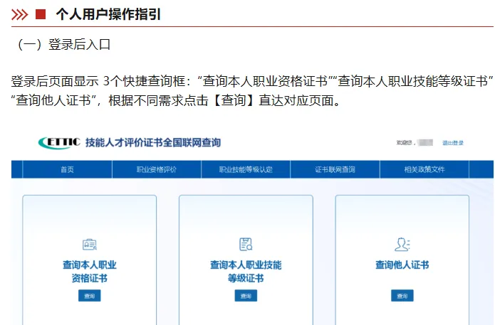 个人用户操作指引 (一)登录后入口 登录后页面显示 3个快捷查询框:“查询本人职业资格证书”“查询本人职业技能等级证书”“查询他人证书”,根据不同需求点击【查询】直达对应页面。 (个人用户登录成功页面图示) (二)分模块操作说明