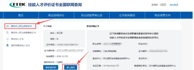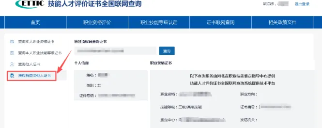 (查询本人职业资格证书页面图示) 2、查询本人职业技能等级证书路径:左侧菜单栏→【查询本人技能等级证书】(或快捷查询框进入)。 查询结果说明:明文显示本人名下所有职业技能等级证书。 授权码管理说明:有证书时点击【生成证书授权码】即可生成证书查询授权码。他人可通过该授权码,在“授权码查询他人证书”模块明文查询您名下所有职业技能等级证书信息。如需停止授权,点击【停止授权】按钮,他人将无法再使用该授权码进行查询。授权码有效期一年。需要恢复授权,点击【恢复授权】按钮。 注意:停止授权后,授权码即时失效。 (查询本人职业技能等级证书页面图示) 3、查询他人单条证书 路径:左侧菜单栏→【查询他人证书】(或快捷查询框进入)。 步骤:完整填写“证书编号、证件号码(身份证号)、姓名”,提交后显示查询结果(脱敏显示)。 (查询他人证书页面图示) (查询他人证书查询结果页面图示) 4、通过授权码查询他人证书 路径:左侧菜单栏→【授权码查询他人证书】 步骤:输入有效授权码,点击【查询】后查看证书明文信息。授权码查询说明:用户可通过授权码,查询他人证书信息,查询结果明文显示。 (授权码查询他人证书查询结果页面图示)