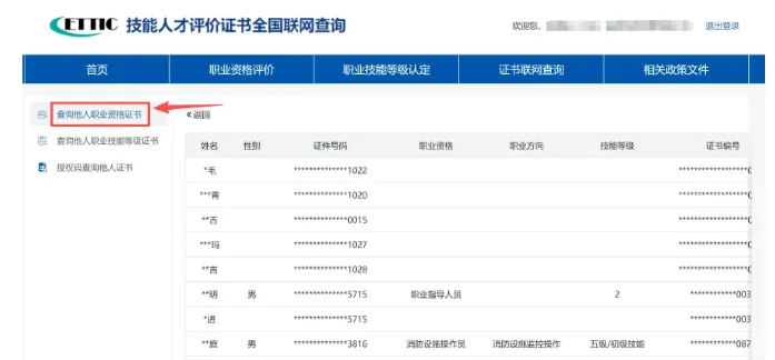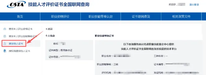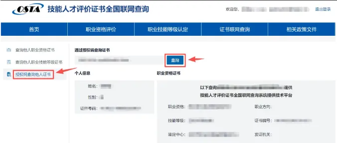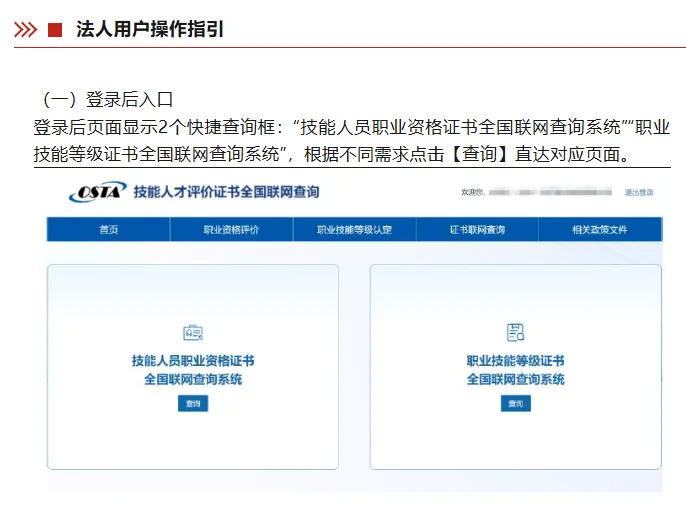 (一)登录后入口 登录后页面显示2个快捷查询框:“技能人员职业资格证书全国联网查询系统”“职业技能等级证书全国联网查询系统”,根据不同需求点击【查询】直达对应页面。 (法人用户登录成功页面图示) (二)查询他人单条证书 进入相应证书查询界面后,依次输入姓名、证件号码、证书编号三项信息,即可查询他人证书信息,查询结果脱敏显示(隐藏部分字段)。