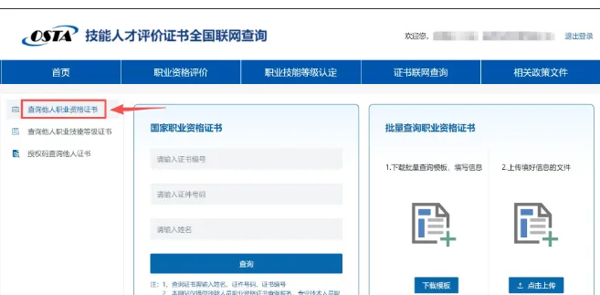(三)批量查询他人证书 法人用户登录后可以批量查询他人证书。为保障查询流畅性,单次上传数据建议控制在50条以内。 (法人用户查询他人职业资格证书页面图示) 路径:登录后→左侧菜单栏→【查询他人职业资格证书/查询他人职业技能等级证书】步骤: 1、点击【下载模板】; 2、按模板完整填写查询信息:姓名、证件号码、证书编号; 3、点击【点击上传】按钮,上传需要查询的证书数据; 4、系统处理后显示脱敏查询结果。 (法人用户批量查询他人职业资格证书页面图示) (四)通过授权码查询他人证书 路径:左侧菜单栏→【授权码查询他人证书】 步骤:输入有效授权码,点击【查询】后查看证书明文信息。 授权码查询说明:用户可通过授权码,查询他人证书信息,查询结果明文显示。