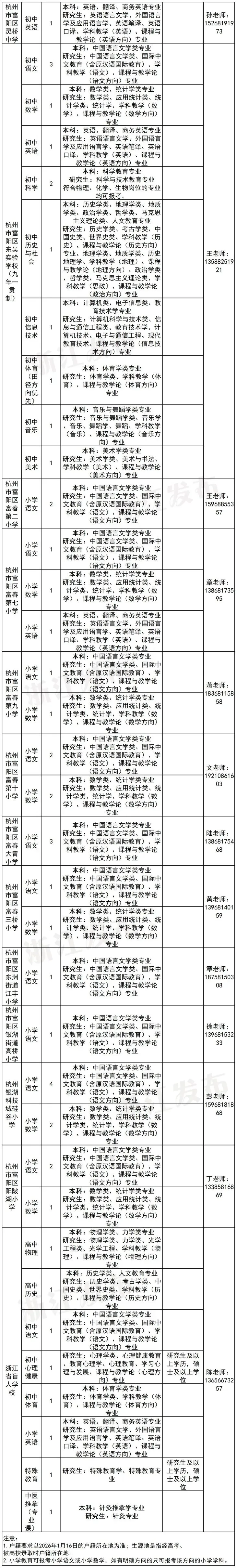 杭州市富阳区决定面向2026年优秀应届毕业生招聘中小学教师,本次招聘教师143名,其中普高18名,职高10名,初中80名,小学27名,浙江省盲人学校8名。
