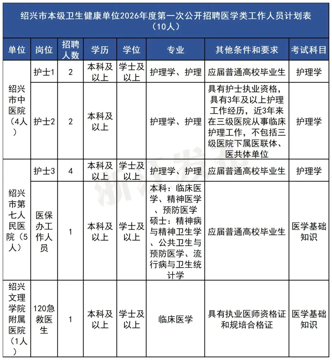 绍兴市本级7家卫生健康单位面向社会公开招聘80名工作人员,均为正式在编人员(其中公立医院为事业编制报备员额管理,市疾病预防控制中心为全额事业编制)。