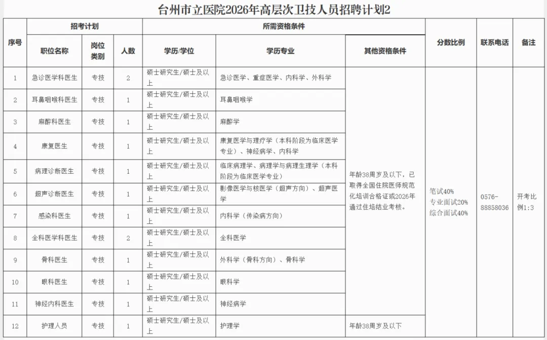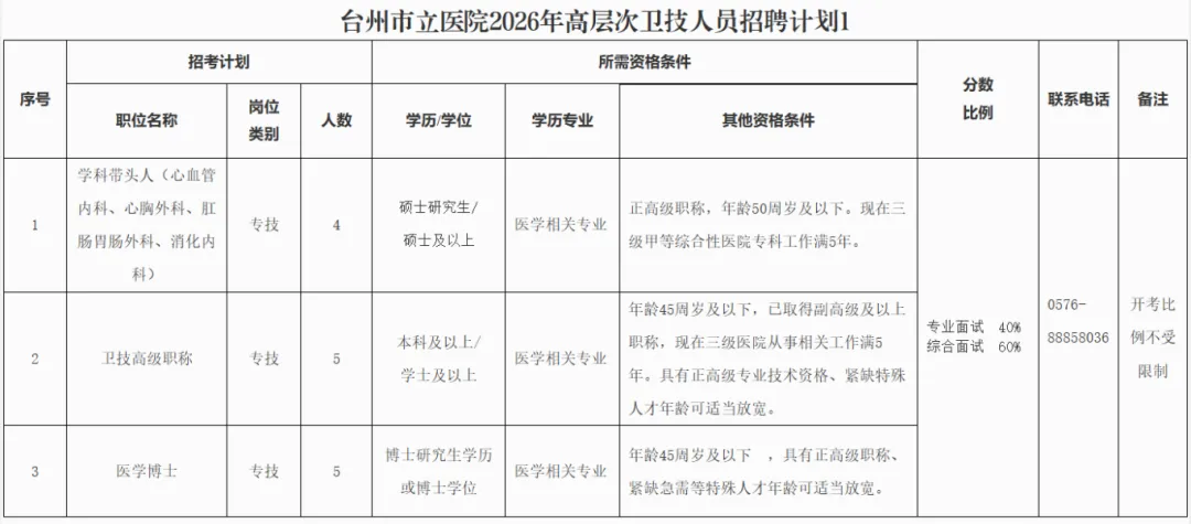 台州市第一人民医院2026年卫技高层次人才招聘计划2