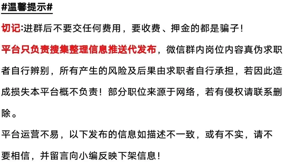 平台只负责搜集整理信息推送代发布,微信群内岗位内容真伪求职者自行辨别,所有产生的风险及后果由求职者自行承担,若因此造成损失本平台概不负责!部分职位来源于网络,若有侵权请联系删除。