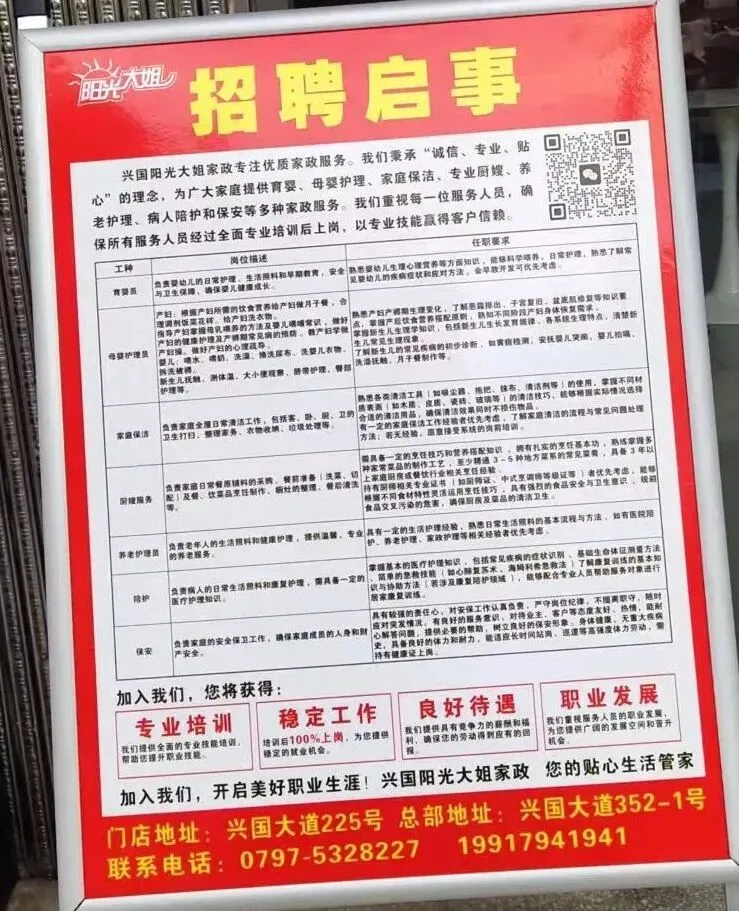 兴国阳光大姐家政专注家政服务,我们秉承“诚信,专业,贴心”的理念,为广大家庭提供育婴,母婴护理,家庭保洁,专业厨嫂,养老护理,病人陪护和保安等多种家政服务,我们重视每一位服务人员,确保所有服务人员经过全面专业培训后上岗,以专业技能赢得客户信赖。