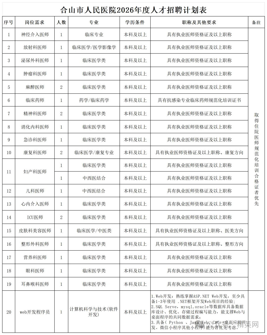 真心爱才、倾心引才、精心用才、求贤若渴合山市人民医院2026年人才招聘公告