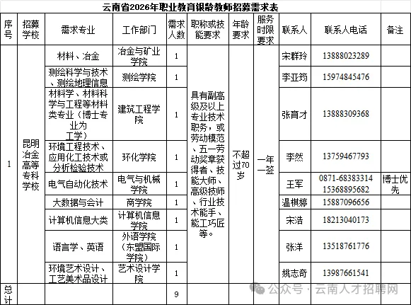 2026年昆明冶金高等专科学校计划公开招募职业教育银龄教师9名,具体招募学院、专业、人数和招募联系方式请查看《昆明冶金高等专科学校2026年职业教育银龄计划教师招募需求表》(附件1)。