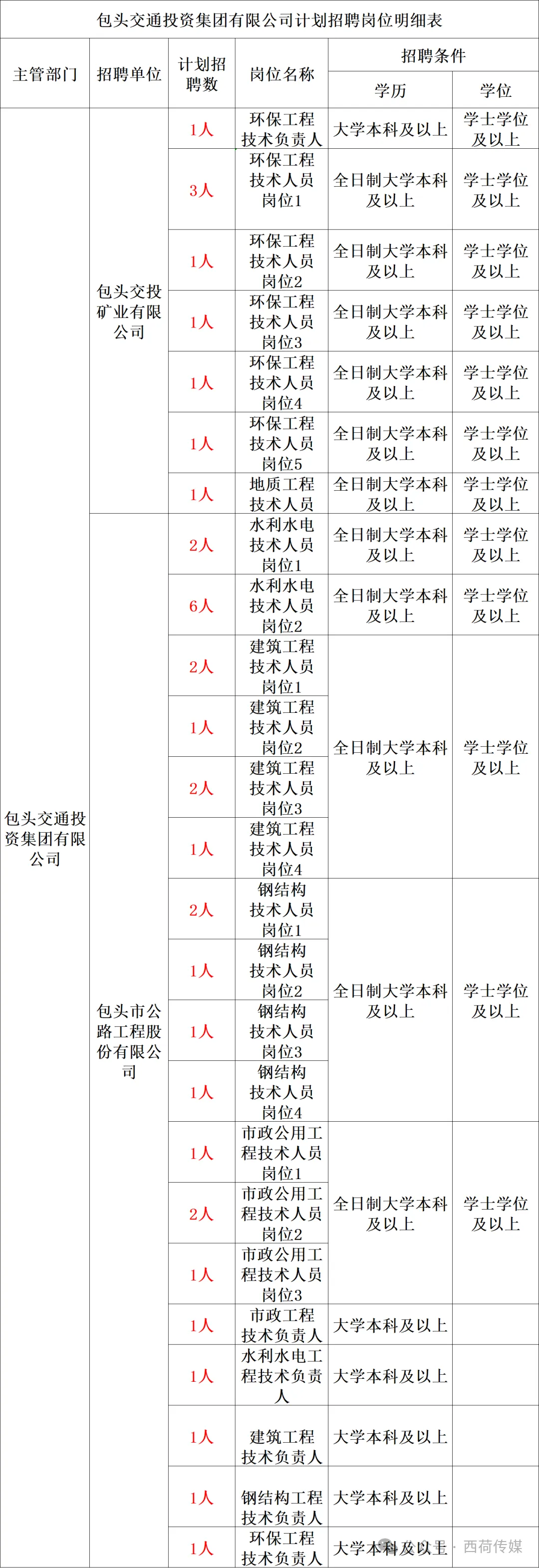 2.《招聘岗位表》中涉及的有关学历、学科、专业等资格条件方面的问题,由包头交通投资集团有限公司负责解释。