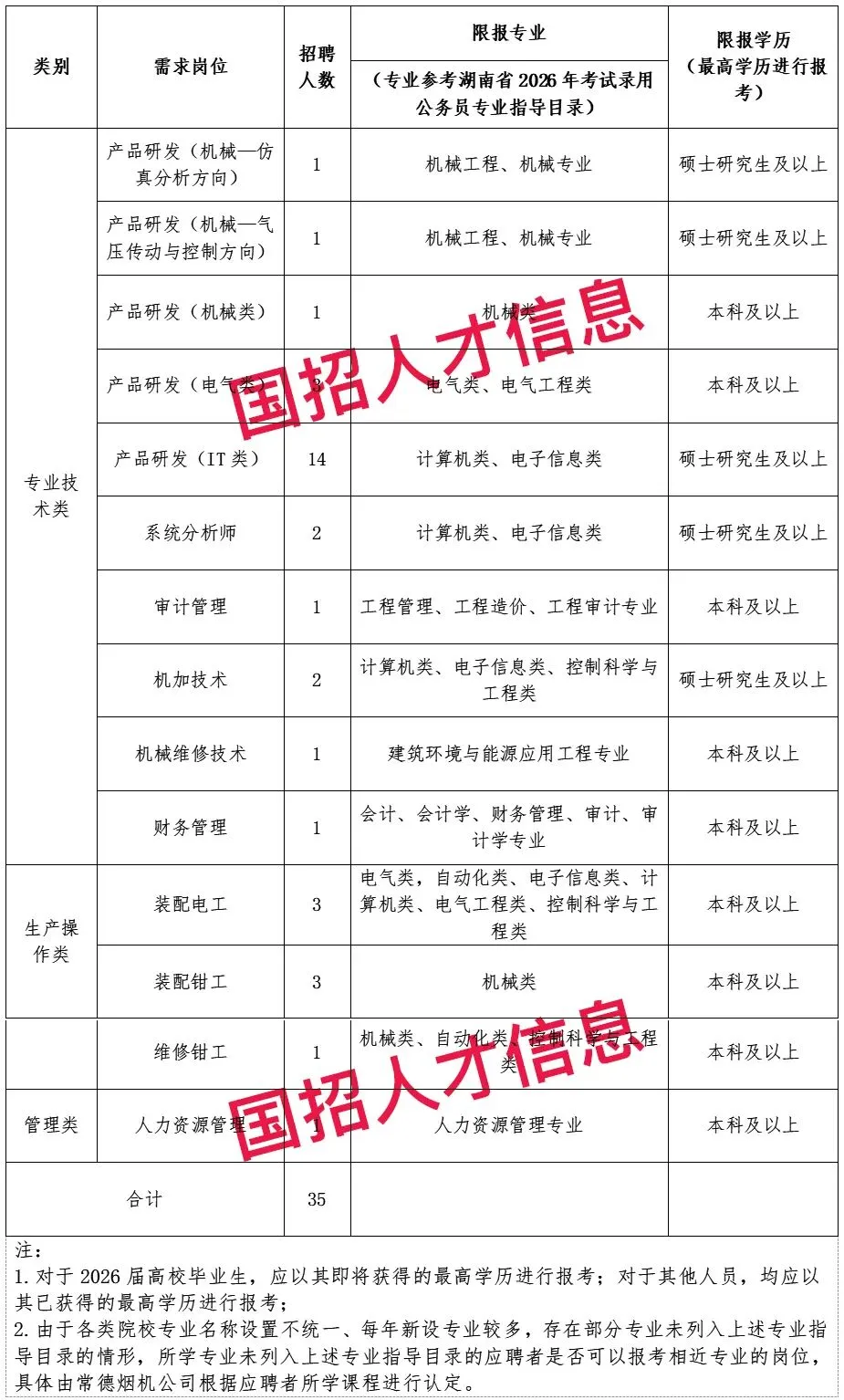 4、35人!常德烟草机械有限责任公司2026年公开招聘公告(1.31)