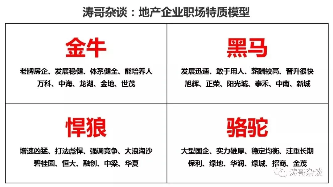 涛哥提出《地产企业职场特质模型》,将房企划分为金牛、黑马、悍狼、骆驼四种特质,帮助大家理解和选择。