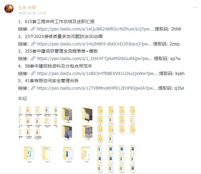 615套工程年终工作总结及述职汇报23个2025装修质量多发问题防治3D动画255套中建项目管理全流程表单+模板58套中建招标资料及分包合同范本41套有限空间安全管理台账已上传至知识星球