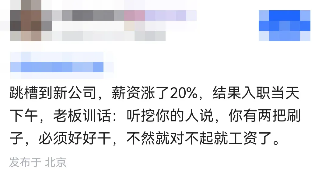 跳槽到新公司,薪资涨了20%,结果入职当天下午,老板叫我过去说:听挖你的人说你有两把刷子,必须好好干,不然就对不起这工资了.