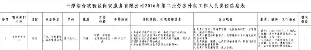 1.招聘岗位要求详见《平潭综合实验区保安服务有限公司2026年第二批劳务外包工作人员岗位信息表》(附件1)。