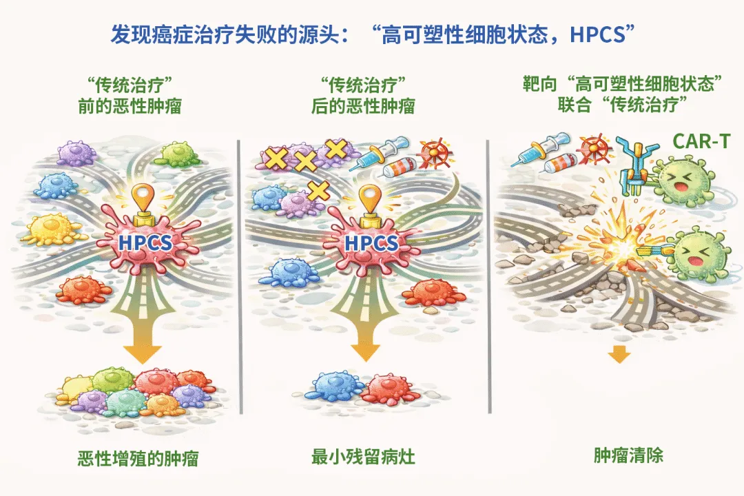 进一步实验表明,在肿瘤发生早期清除HPCS虽不影响初始病灶的形成,却能有效阻断其向恶性阶段演进;而在晚期肿瘤中靶向清除这类细胞,则显著抑制肿瘤生长。更关键的是,临床治疗后残留并导致复发的“最小病灶”,主要就来源于HPCS。这一发现从功能层面首次证实,驱动治疗耐受的核心细胞状态是可被靶向干预的,从而挑战了“残留病灶不可避免”的传统认知。