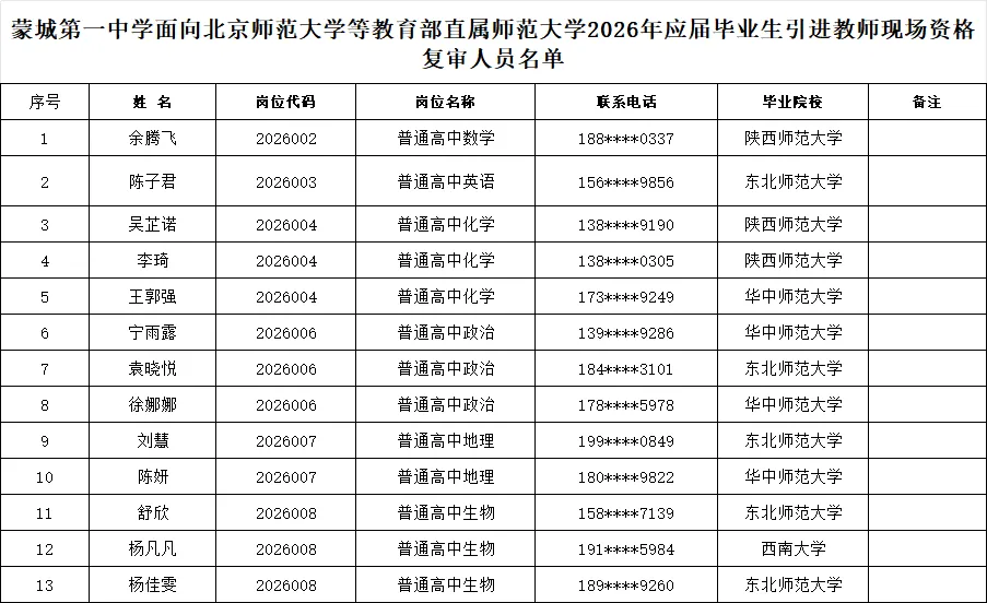 根据《蒙城第一中学面向北京师范大学等教育部直属师范院校2026年应届毕业生人才引进公告》精神,现将蒙城第一中学面向北京师范大学等教育部直属师范院校2026年应届毕业生人才引进现场资格复审、面试工作的有关事宜公告如下: