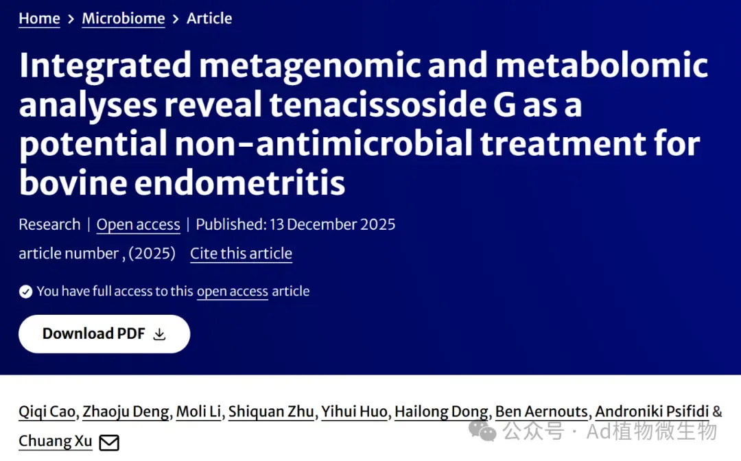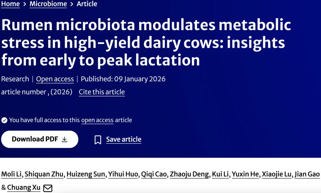 近日,中国农业大学动物医学院及兽医公共卫生安全全国重点实验室的徐闯教授团队,在国际知名微生物组学期刊《Microbiome》上发表了一篇题为《Rumen microbiota modulates metabolic stress in high-yield dairy cows: insights from early to peak lactation》的研究论文。该研究聚焦于高产奶牛从泌乳早期到高峰期的过程中,瘤胃微生态结构、功能及其代谢产物动态变化对机体代谢应激的调控作用。该团队近日还在《Microbiome》上发表了一篇题为《Integrated metagenomic and metabolomic analyses reveal tenacissoside G as a potential non-antimicrobial treatment for bovine endometritis》的相关研究成果。点击阅读: