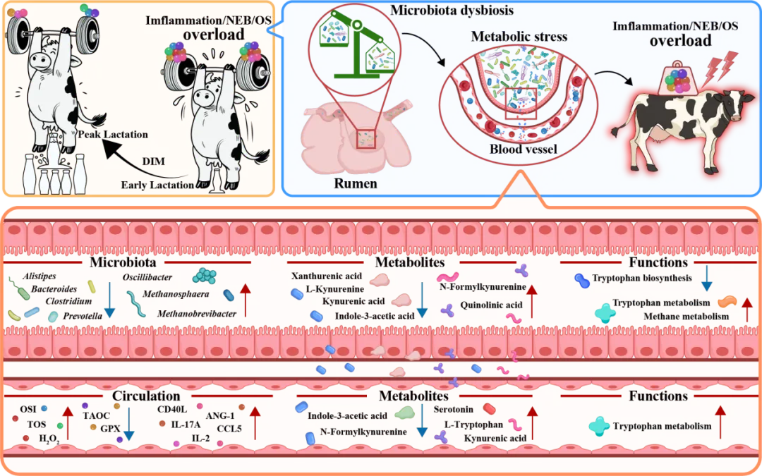 在这一过程中,研究人员通过采用纵向多组学方法,深入探讨了高产奶牛泌乳早期至高峰期阶段所面临的代谢稳态紊乱问题,包括氧化应激、炎症反应和脂肪过度动员等现象,这些是引起代谢应激的重要病理基础。研究以高产泌乳奶牛作为研究对象,围绕“瘤胃微生物—代谢物—宿主代谢应激”这一核心调控轴线,整合了瘤胃宏基因组、瘤胃与血清代谢组以及炎症因子谱等数据,揭示了奶牛代谢应激随泌乳进程的变化特征。