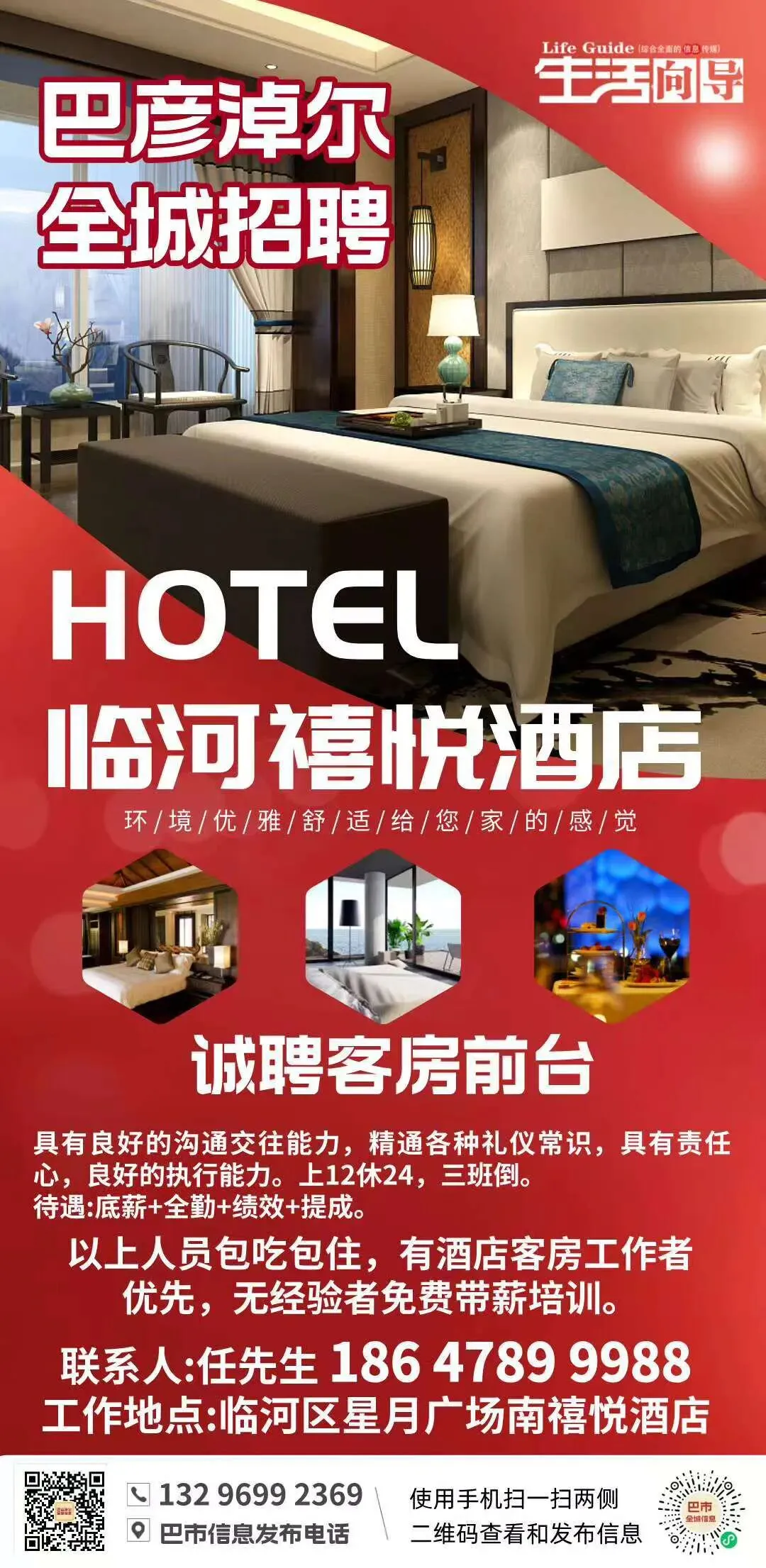 巴市招聘:临河禧悦酒店包吃住招聘客房前台,无经验可带薪培训