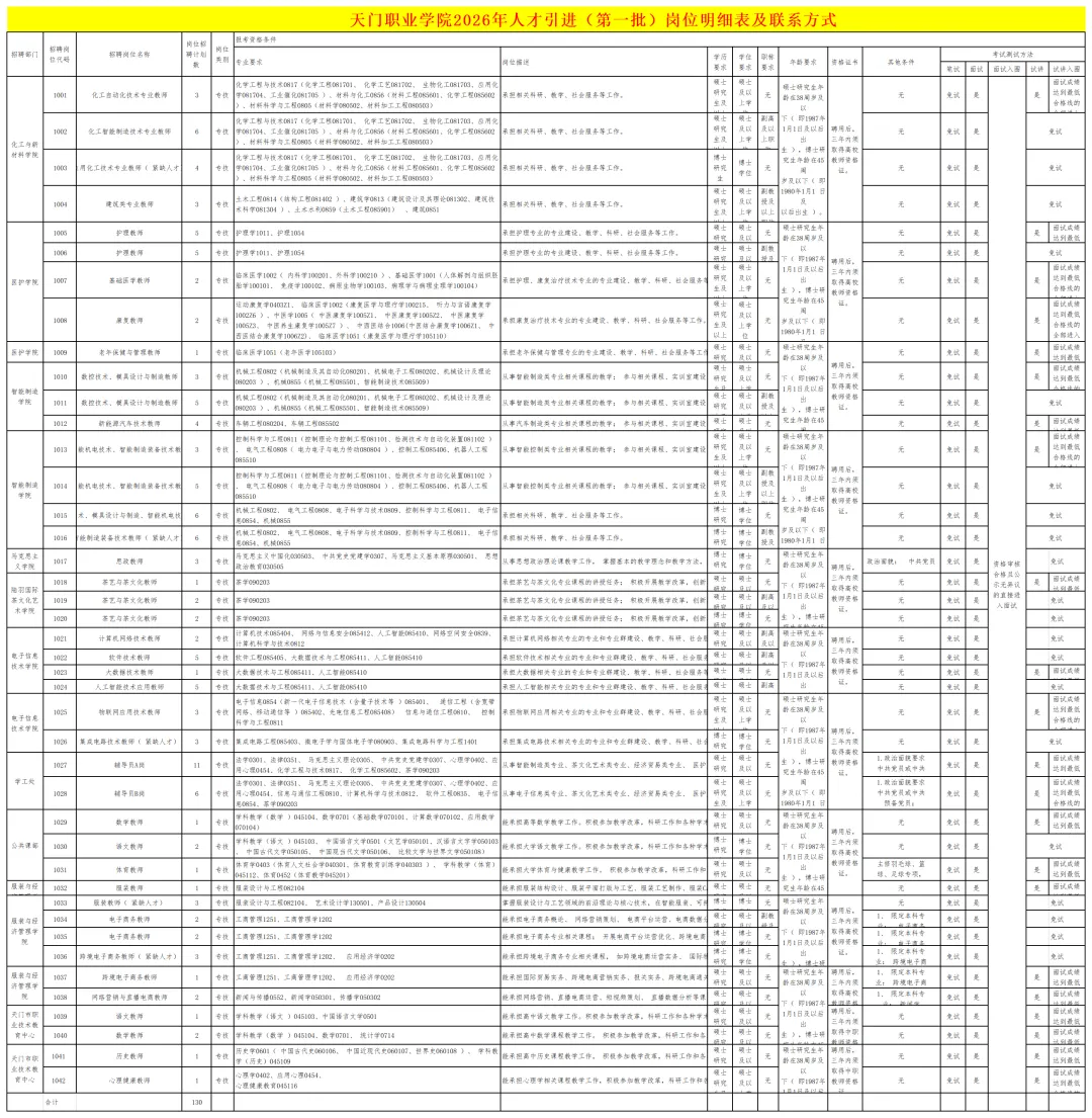 1.招聘部门、岗位、招聘计划数及报考资格条件详见《天门职业学院2026年人才引进(第一批)岗位明细表及联系方式》(附件1)。