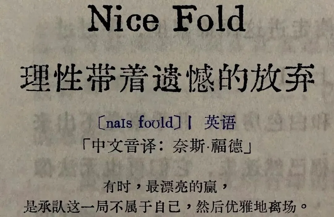 最近看到了一个新的词,Nice Fold,是理性带着遗憾的放弃。 与之相对应的是另一个词,HeroCal 是明知有风险,却依然坚定选择的跟注。 源自扑克术语。Fold意为弃牌,即放弃当前手牌,退出本轮下注。Nice在此并非美好,而是对高超策略与冷静决断的赞赏。组合在一起,专门用来称赞玩家在看似有机会,实则胜算渺茫时,智的撤退决定。 Nice Fold不是懦弱的逃离,而是在权衡所有可能性后,带着清醒认知与一丝遗憾,所做出的最优止损。 在电影《教父》中,迈克尔·柯里昂决定放弃合法家族生意,彻底投身黑暗生意,是一次冷酷的Nice Fold,他折叠了对正常生活的幻想,以换取家族生存。 《了不起的盖茨比》的结尾,尼克对东部生活与虚幻美国梦的幻灭与离开,也是一次Nice Fold。 在创业或科研中,果断停止一个拨入巨大但前景黯淡的项目。在一段内耗的关系中,率先清醒地抽身。这些都需要Nice Fold 的勇气与智慧。 人生并非每一手牌都要跟到底。懂得在恰当的时机,为自己叫一次Nice Fold,是成熟最标志性的签章。它不是承认失败,而是将有限的筹码,从必输的局中赎回,押注给未来更值得的篇章。 人到中年逐渐学会不再执着于所有事。有些感情明明还在意,却选择放手;有些机会看似诱人,却清楚那不是自己的路。