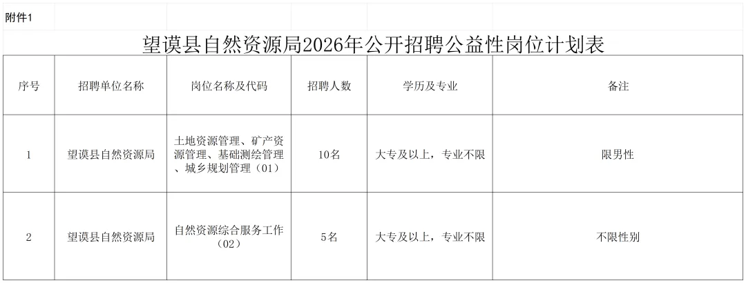 本次计划公开招聘公益性岗位人员15名。具体岗位为:望谟县土地资源管理、矿产资源管理、基础测绘管理、城乡规划管理。