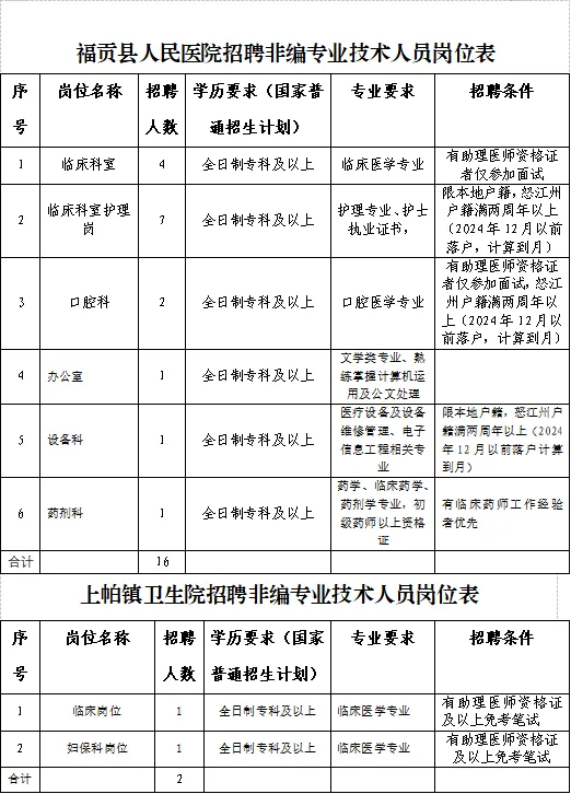 福贡县人民医院拟招聘专业技术人员16名;上帕镇卫生院拟招聘2名。