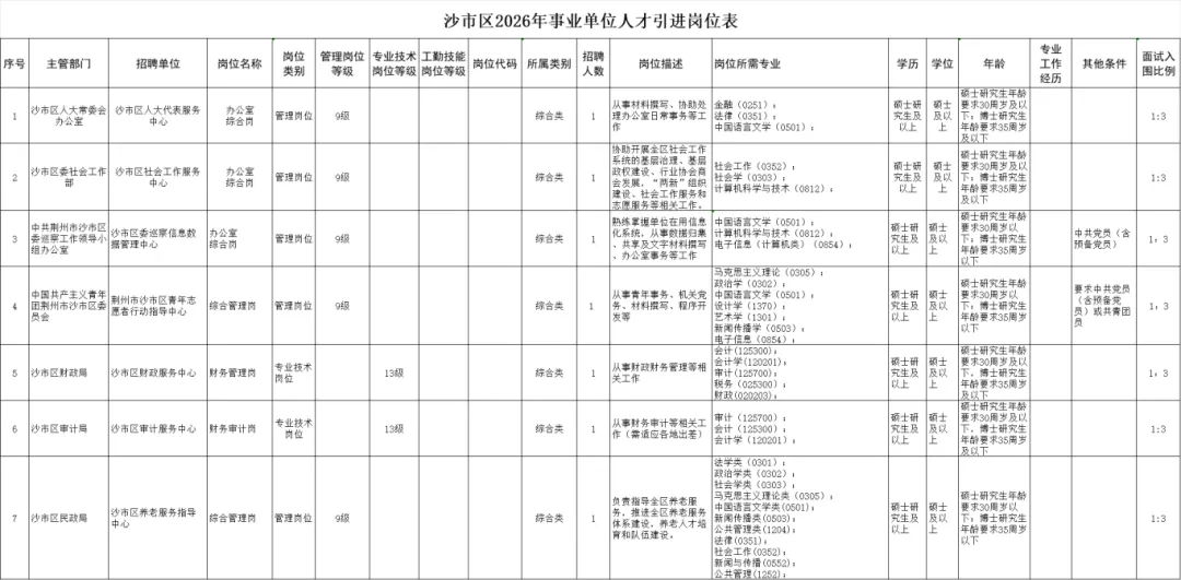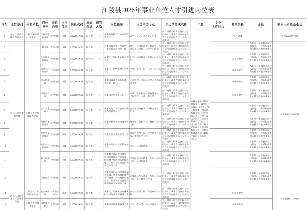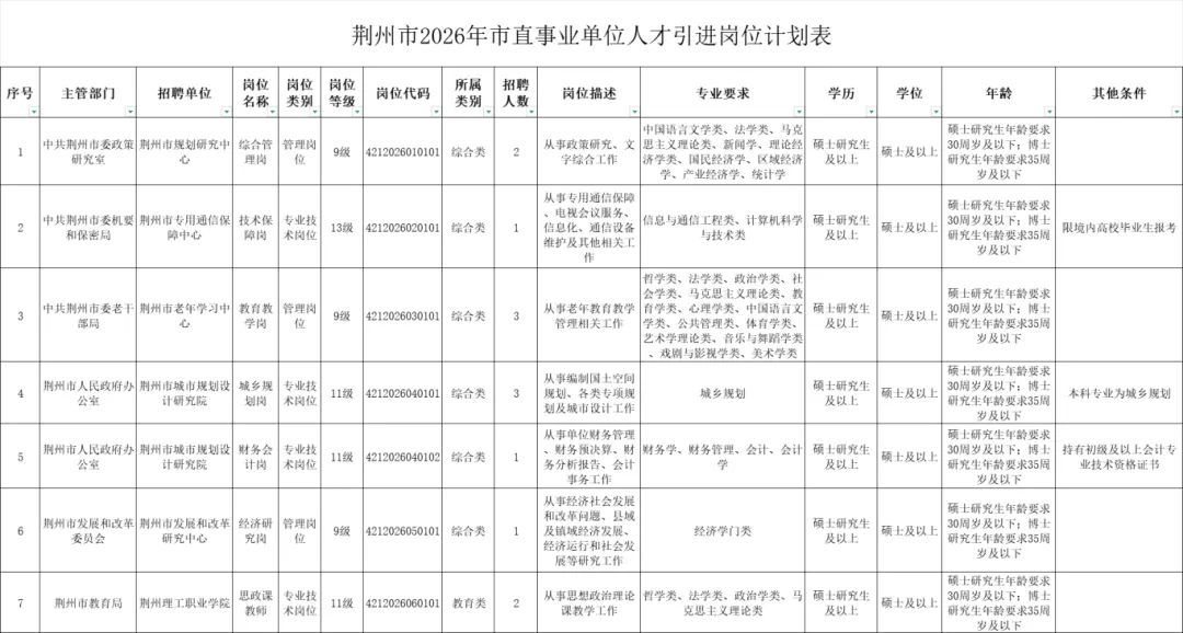 本次计划引进人才47名。具体引进专业及要求详见附件《江陵县2026年事业单位人才引进岗位表》。
