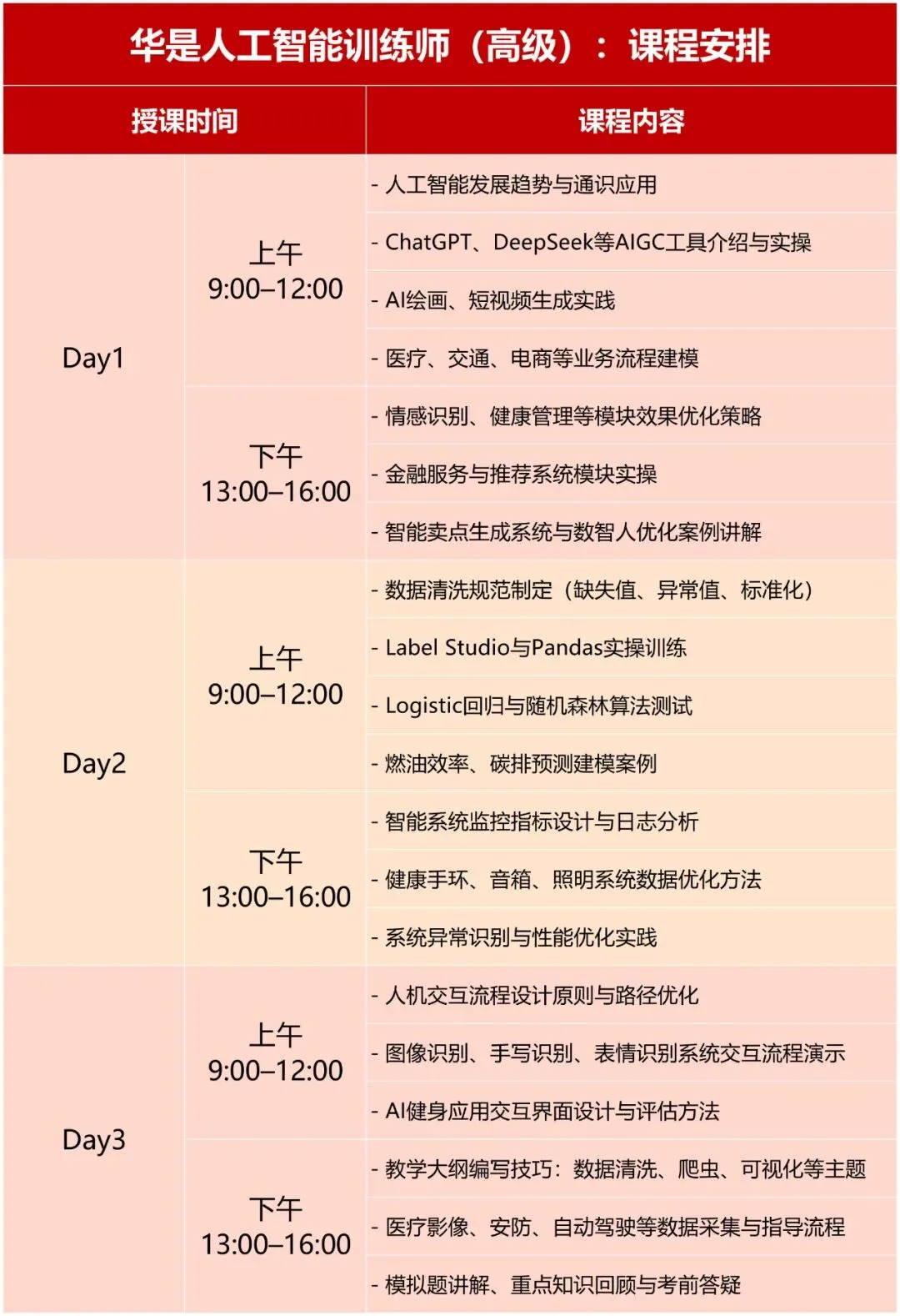 为了积极响应国家“人工智能+”的人才战略部署,培养适应市场急需的AI技术人才,帮助对AI感兴趣、急需自我提升、追求有更大发展、有意转行换赛道,开拓更多就业的可能性,上海华是学院特开展人工智能训练师(三级)考前培训项目,旨在通过系统培训,使学员掌握人工智能训练师所需的专业知识和技能,能够胜任相关岗位工作,并协助学员进行职业技能等级证书认证。结合不同行业应用场景,如智能制造、智慧医疗、金融科技等,让学员了解AI在各领域的应用现状和发展趋势,拓宽学员的职业发展途径。