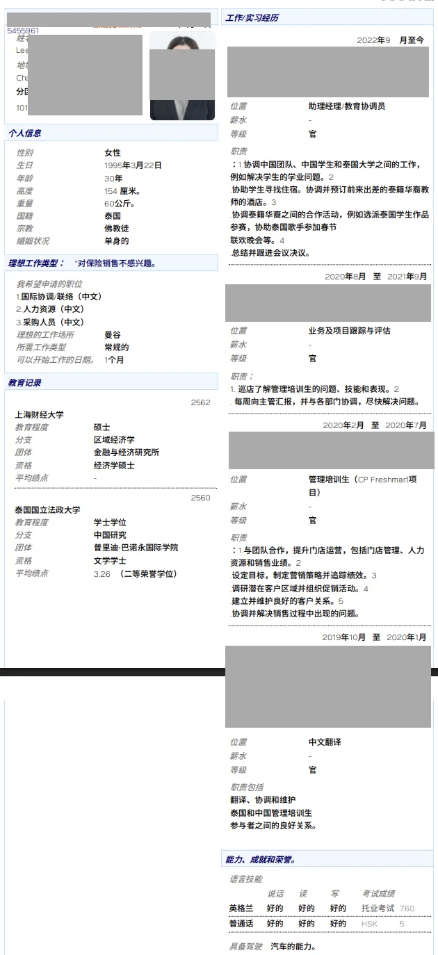 【泰籍人才@曼谷】中/泰/英+6年协调/翻译+中国留学+HSK5级+托业760#260122