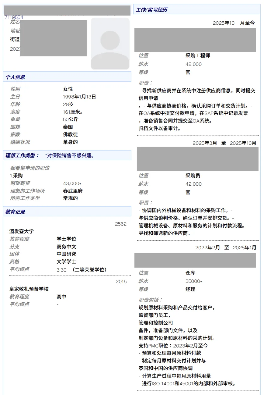 【泰籍人才@春武里】中/泰+5年采购工作经验+HSK5级+会开车#260122