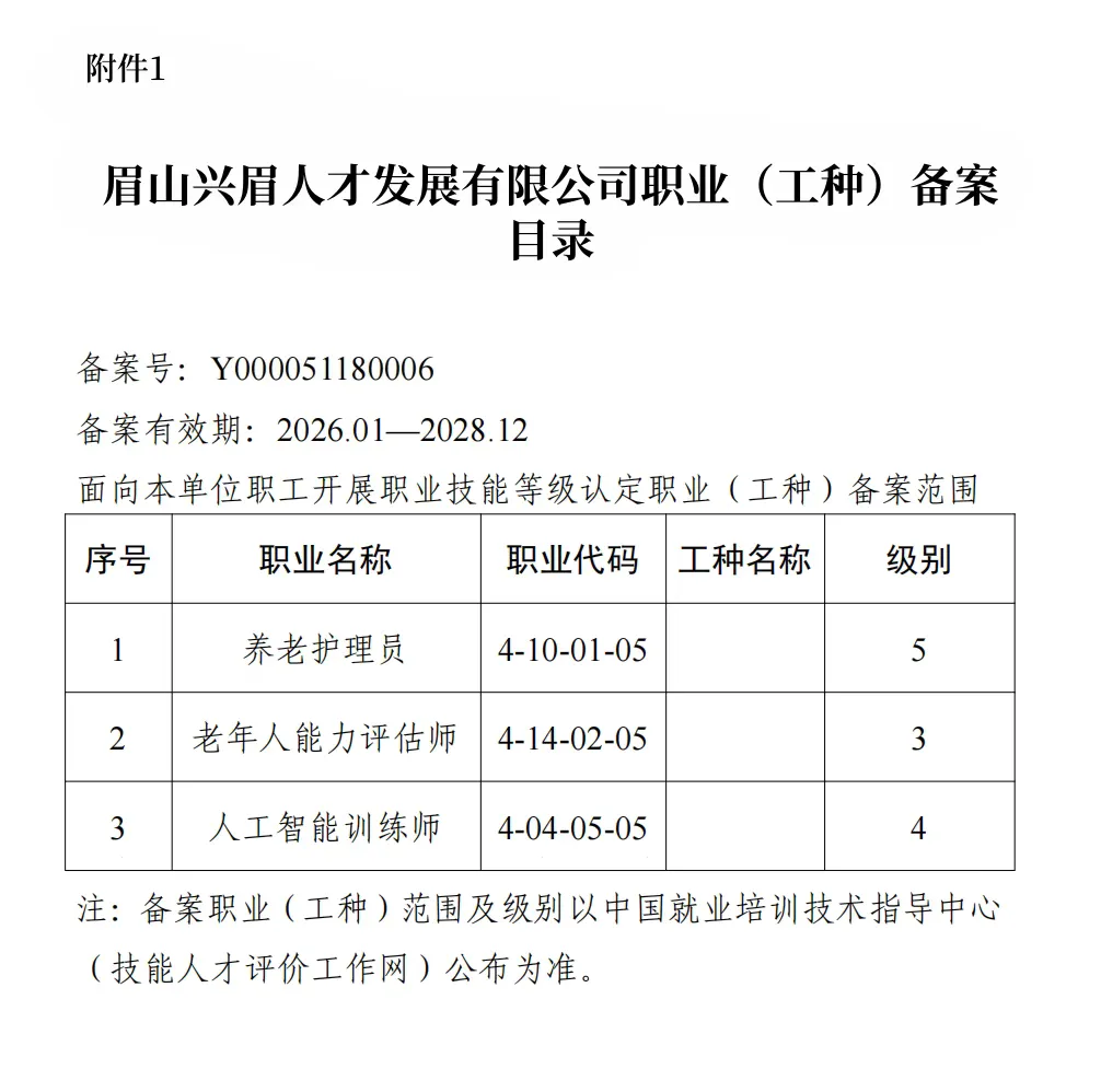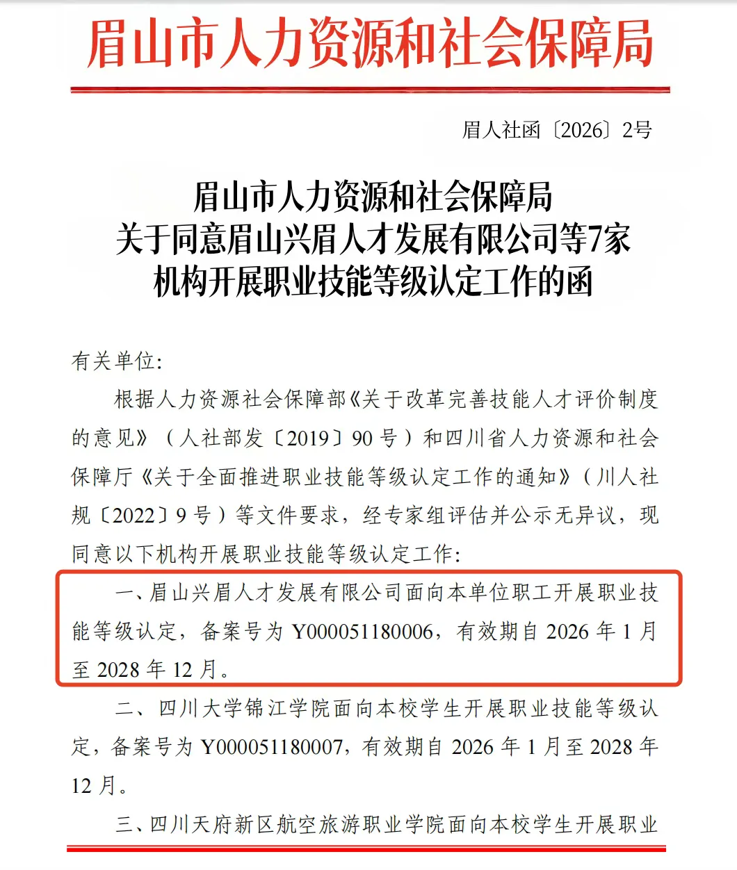 2026年1月20日,眉山市人力资源和社会保障局正式下发《关于同意眉山兴眉人才发展有限公司等7家机构开展职业技能等级认定工作的函》(眉人社函〔2026〕2号),兴眉人才公司成功获批3项职业技能等级认定资质(备案号:Y000051180006)。