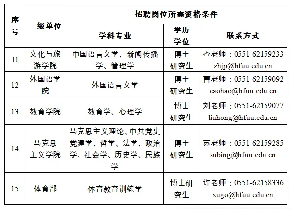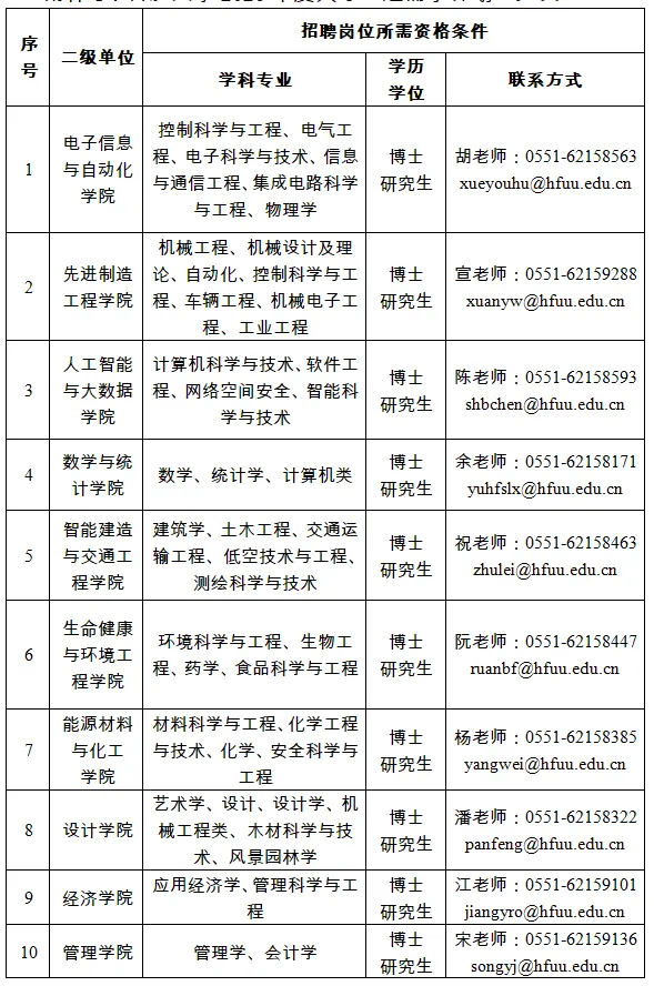 如对招聘工作有不明之处,请与我校人事处联系。联系人:薛老师、黄老师;联系地址:合肥市经开区锦绣大道99号合肥大学人事处;服务热线:0551-62158079;电子邮箱:rczp@hfuu.edu.cn