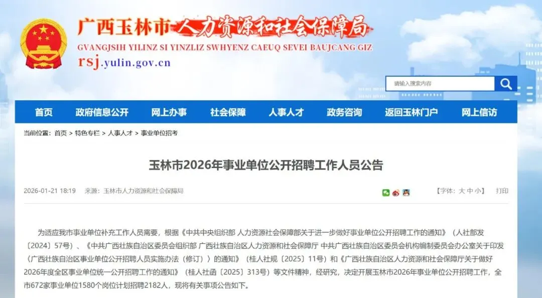 为适应我市事业单位补充工作人员需要,根据《中共中央组织部 人力资源社会保障部关于进一步做好事业单位公开招聘工作的通知》(人社部发〔2024〕57号)、《中共广西壮族自治区委员会组织部 广西壮族自治区人力资源和社会保障厅 中共广西壮族自治区委员会机构编制委员会办公室关于印发〈广西壮族自治区事业单位公开招聘人员实施办法(修订)〉的通知》(桂人社规〔2025〕11号)和《广西壮族自治区人力资源和社会保障厅关于做好2026年度全区事业单位统一公开招聘工作的通知》(桂人社函〔2025〕313号)等文件精神,经研究,决定开展玉林市2026年事业单位公开招聘工作,全市672家事业单位1580个岗位计划招聘2182人,现将有关事项公告如下。