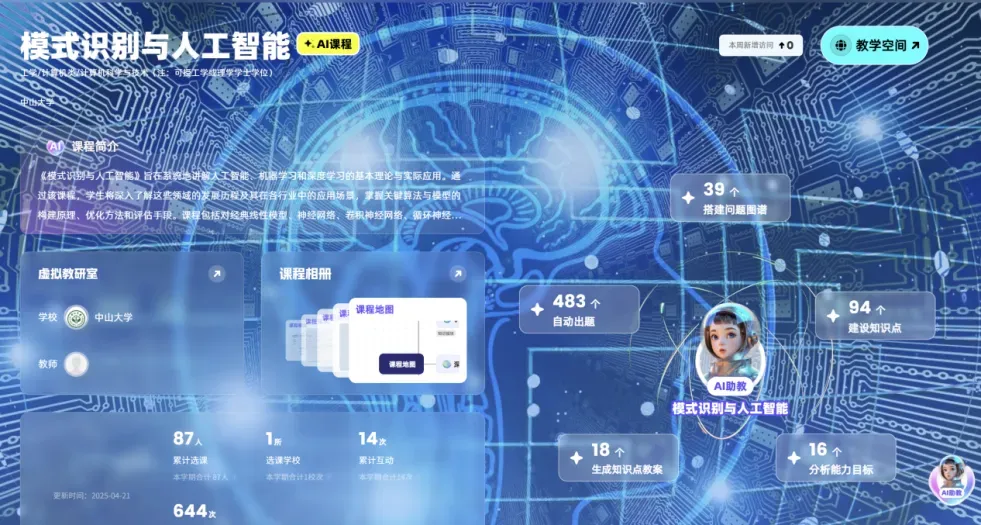 点击图片 即可查看课程详情为积极响应教育数字化战略,中山大学于2024年启动“双百计划”,旨在建设100门AI示范课程和100部数字(新形态)教材,推动教学模式的创新与变革。在AI课程建设方面,2025年共启动111门AI课程的立项建设,课程分类包括人工智能通识课程、人工智能专业核心课程、人工智能技术赋能课程以及人工智能学科交叉课程四类。经过一个学期的努力,学校在AI课程体系建设已初显成效,打造了一批示范性课程。这些课程深度融合人工智能技术,为学生提供了前沿、多元的学习体验。下面,让我们一同领略这些课程的特色与魅力!