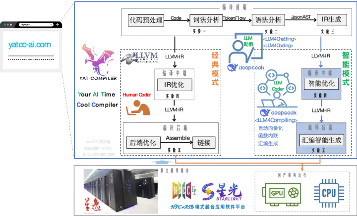 该课程依托YatCC-AI智能编译教学平台(yatcc-ai.com),以“智能应用、智能开发、智能创新”为核心理念,将超级计算与人工智能技术深度整合,打造了一站式现代化智能实践平台。YatCC-AI依托“天河星逸”超算强大算力和原生DeepSeek-R1大模型智能优势,构建了覆盖基础到前沿的全维度实践环境,提供智能交互问答(LLM4Chatting)、智能代码开发(LLM4Coding)、智能编译研究(LLM4Compiling)在内的完整教学支持体系。