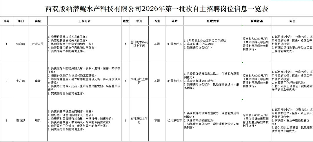 1.西双版纳潜鲲水产科技有限公司2026年第一批次自主招聘岗位信息一览表