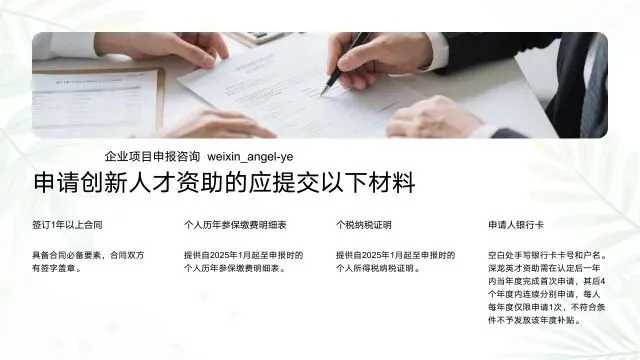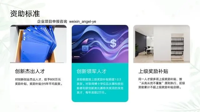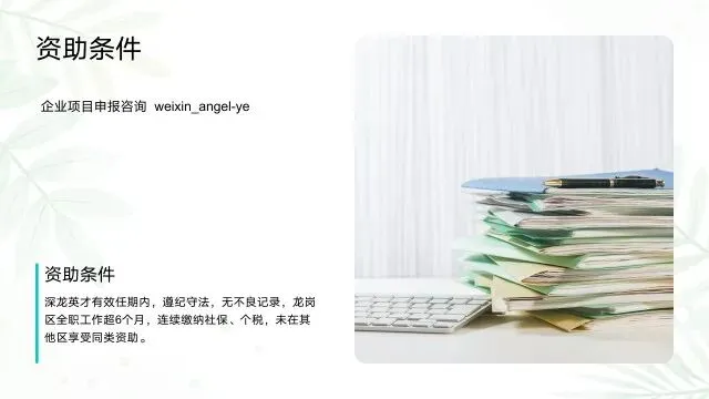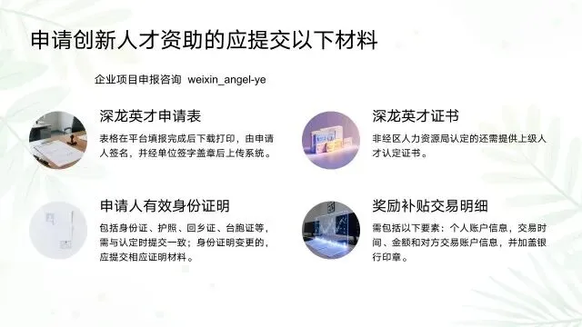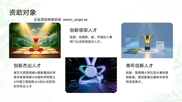 国家高新技术企业、专精特新中小企业、专精特新“小巨人”重点小巨人、单项冠军、绿色工厂等项目申报,可咨询工作人员微信 weixin_angel-ye深圳市龙岗区人力资源局关于组织开展龙岗区深龙英才计划创新创业资助申报工作的通知-深圳政府在线_深圳市人民政府门户网站 https://www.sz.gov.cn/szzt2010/wgkzl/jcgk/jcygk/zdzcjc/content/post_12605899.html