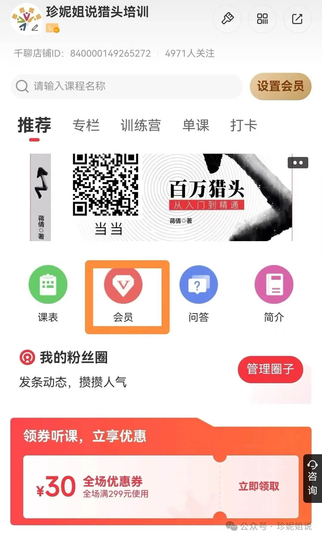 店铺主页面,点击[会员],进入会员页面。根据需要,采购不同的会员卡,或仍选择直接买课。