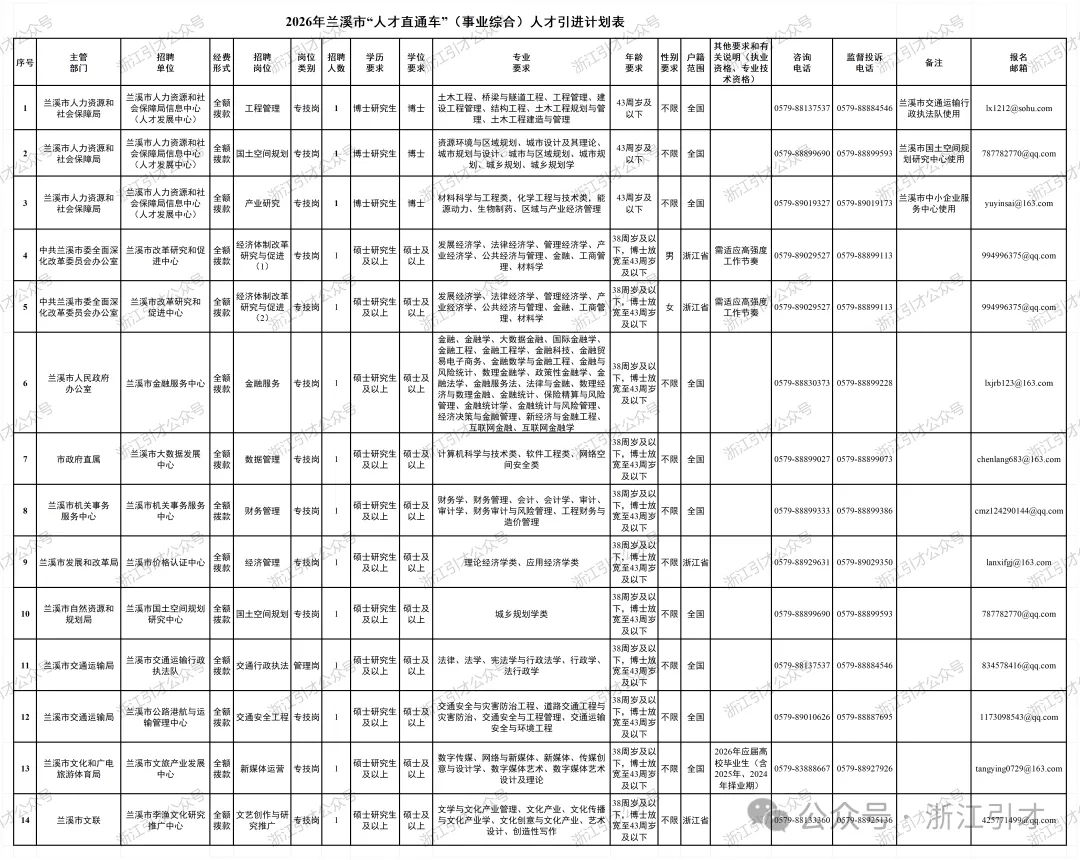 根据兰溪市委市政府“聚兰工程”政策要求,依据《浙江省事业单位公开招聘人员暂行办法》公开招聘的有关规定,储备一批市重点部门和乡镇街道专业型年轻领导干部和专业型技术骨干培养对象,现就组织2026年兰溪市“人才直通车”招聘发布相关岗位,计划招聘事业单位工作人员14 名。现将具体事项公告如下:2.坚决拥护中国共产党的领导,无参加封建迷信等活动。3.遵纪守法,品行端正,愿意履行所在单位人员的义务。4.具有与招聘岗位要求相适应的学历、专业、技能条件。面向普通高校博士研究生、硕士研究生。7.曾因犯罪受到刑事处罚的人员,曾被开除公职的人员,受过党纪、政纪、校纪处分的人员均不得报名。8.有法律、法规规定不得招聘为事业单位工作人员情形的不得报考。9.兰溪市在职在编事业单位人员不得报考本次事业单位招聘。见附件1《2026年兰溪市“人才直通车”(事业综合)人才引进计划表》年龄和户籍时间截止到公告之日。年龄要求38周岁及以下(1987年1月20日(含)以后出生),年龄要求43周岁及以下(1982年1月20日(含)以后出生)。(一)邮件报名。每人限报一个职位,填写《2026年兰溪市“人才直通车”(事业综合)人才引进报名信息表》(见附件2),随同报名需提供的相关资料压缩包发送到报名邮箱(事业单位报名邮箱见计划表)。打包文件命名方式及邮件主题:姓名+应聘单位和岗位+联系电话,邮件发送后必须致电报考单位核实查收(时间:工作日9:00-11:30,14:30-17:30),因报考人邮件发送后未致电报考单位核实查收,造成邮件未接收成功致无效报名的,责任由报考人自负。有疑问需要咨询时,可直接与招聘单位联系,咨询电话见计划表。(二)报名时间:公告发布之日至2026年2月26日下午5时30分。事业单位资格确认,采取网络确认为主,现场确认为辅的办法进行,相关资料真实性由考生自主负责。资格确认通过后进入面试环节。需提供的资料为:身份证、户口本、学历学位证书、未取得学历学位证书的2026年应届毕业生需提供就业推荐表或就业协议书(附学信网学籍在线验证报告),填报贴有二寸正面免冠彩色照片报名表一份(见附件2)。国(境)外学历人员须提供教育部中国留学服务中心出具的境外学历学位认证书。其他地区机关、事业单位在编正式工作人员还须提供单位和主管部门同意报考的证明原件。目前在读的全日制普通高校研究生不能以原已取得的学历、学位证书报考。面向硕士研究生的岗位,单个岗位硕士研究生超过50人(含)以上的进行笔试,按1:5的比例确定面试人数。笔试成绩不计入总分,只作为确定入围面试人员的依据。博士研究生不参加笔试,直接入围面试,不占1:5的确定面试人数比例。(三)事业单位面试人数不受开考比例限制,经确认符合条件的考生进入面试,面试成绩满分为100分,面试成绩未达到70分的取消录取资格。面试成绩相同的进行加试,加试的内容和方式另行通知。事业单位体检标准参照国家公务员的体检标准执行。按面试成绩从高分到低分1:1的比例进行体检,放弃体检或体检不合格的,从该职位总成绩高分到低分依次予以递补。报考人员放弃体检的,视作放弃录取资格。对体检合格人员按1:1的比例进行考察,放弃考察或考察不合格的,在该职位面试成绩从高分到低分依次予以递补。考察标准参照国家公务员的有关考察规定执行。考察合格后,向社会公示5个工作日,公示无异议的,按规定办理聘用手续。逾期未办理聘用手续的,作自动放弃处理,取消聘用资格,缺额人数不再递补。未能在2026年12月31日前取得毕业证书的考生取消聘用资格。政治待遇:事业单位实行跟踪管理,纳入干部队伍建设总体规划。其中博士研究生,聘用后直接安排中层正职岗位;硕士研究生聘用后,一年后表现优秀并符合条件的可优先提拔为中层副职岗位。经济待遇:面向博士研究生的兰溪市人力资源和社会保障局信息中心(人才发展中心)工程管理岗、国土空间规划岗、产业研究岗,可按照协议性工资的方式进行确定;其他博士研究生聘用后享受副局长级事业单位工资福利待遇。硕士研究生,聘用后享受中层副职工资福利待遇(绩效上浮方式)。职称待遇:事业单位引进人才评聘专业技术职务,初次进入单位不受所在单位专业技术岗位数额和结构比例限制。人才引进的硕士(博士)研究生如转岗或调离招聘单位的,相关待遇不再享受。(二)招考专业由招聘单位及其主管部门参考《2026年公务员招考专业参考目录》审查认定并负责解释。(三)从招聘到使用进行全过程管理。报考人员在报名资格审查中提交的所有材料应当真实、准确、有效。凡提供虚假信息和材料获取报考资格的,或有意隐瞒本人真实情况的,一经查实,即取消录用资格和解聘。(四)对招聘工作及相关信息有异议的,请在信息公布之日起5日内向兰溪市人力资源和社会保障局事业单位人事管理科(电话:0579-88891752)反映,以便及时研究处理,逾期不受理。1.2026年兰溪市“人才直通车”(事业综合)人才引进计划表2.2026年兰溪市“人才直通车”(事业综合)人才引进报名信息表温馨提示:本公众号所有招聘信息均为转载企业或单位信息,内容的真实性、准确性、完整性和合法性均由招聘企业或单位负责,如遇以报名等为由收费,请谨慎核实,以防受骗。本公众号不收取简历,请保护好个人隐私。一切交易或合作均视为用户和企业