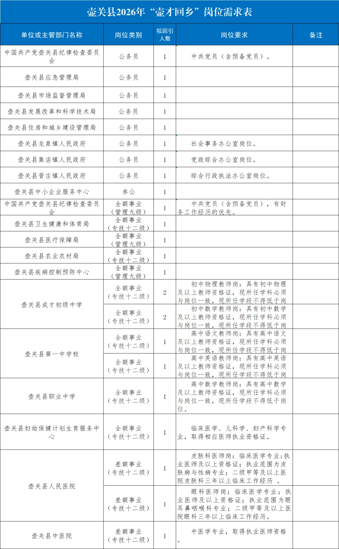 4.具体岗位要求详见《壶关县2026年“壶才回乡”岗位需求表》,以下简称《岗位表》(附件1)。