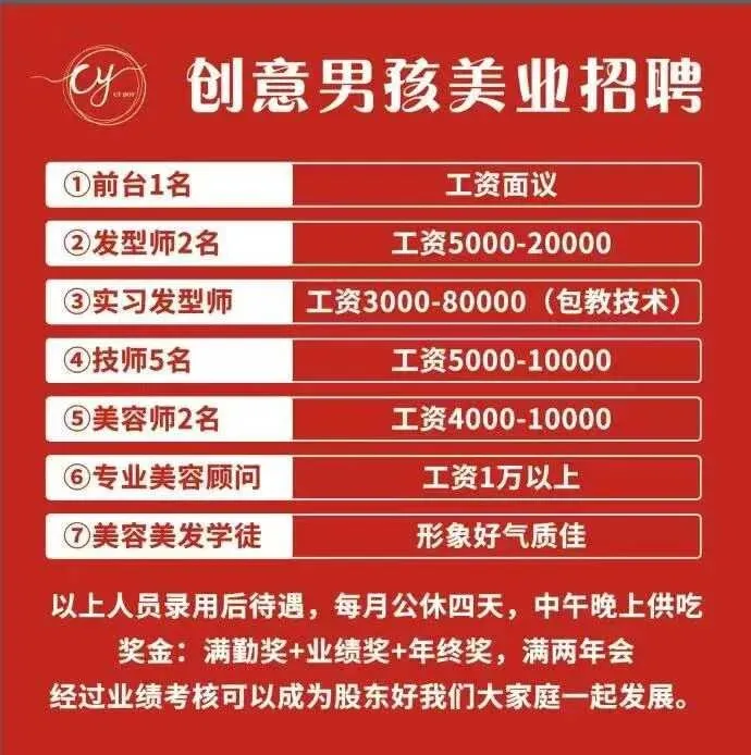 【招聘】抚松创意男孩美业招聘1前台收银1名,工资面议2发型师2名5000-20000,3实习发型师3000-8000(包教技术)4优秀技师5名5000-10000,5美容师2名4000-10000 ,6专业美容顾问1万以上 7美容美发带薪学徒形象好气质佳(以上人员录用后待遇)每月公休四天:中午晚上供吃:住房补助奖金:满勤奖+业绩奖+年终奖,满两年会,经过业绩考核可以成为股东加入我们大家庭一起发展。应聘电话☎️13943370595微信同步