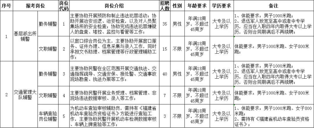 本次招收辅警100名,其中基层派出所辅警50名,交通管理大队辅警50名,具体岗位及要求等详见下图。