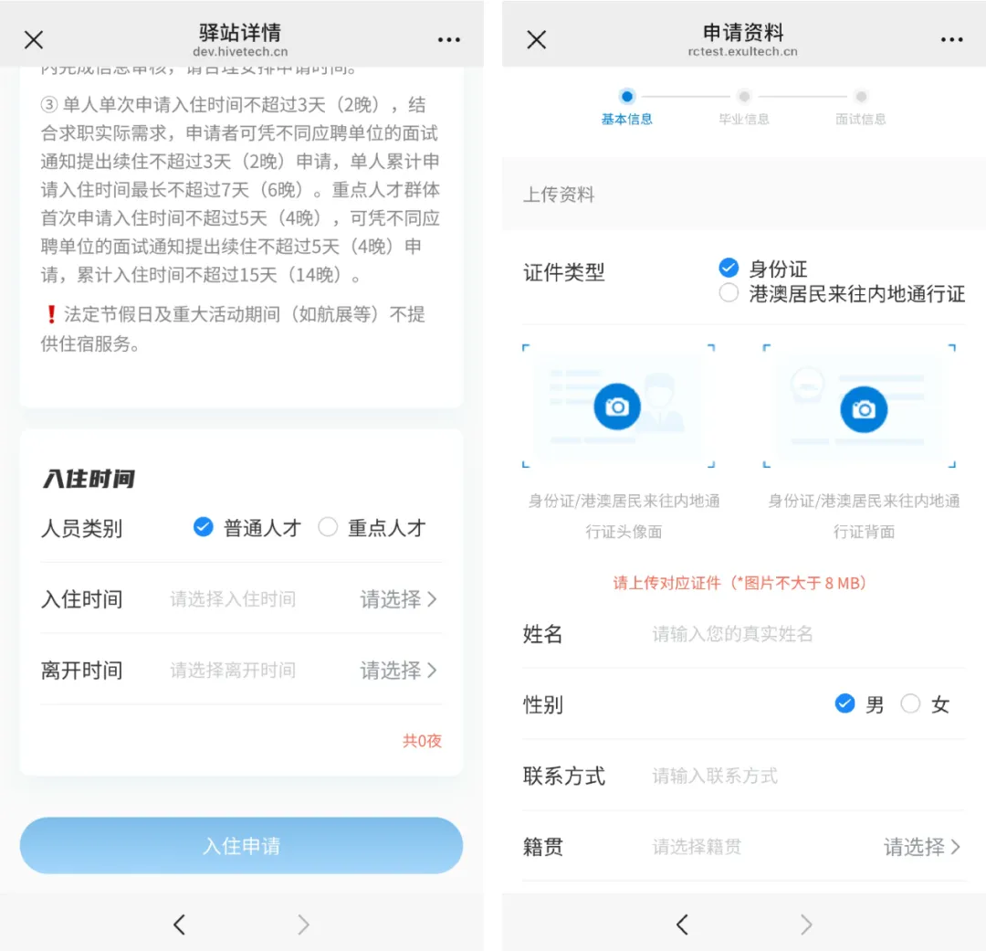 ②申请:登录完成后,回到系统首页,点击“驿站列表”,选择入住地区,再选择入住站点,点击“入住申请”,选择人员类别,填写入住时间,以重点人才身份申请还需选择人才类型,再次点击“入住申请”,最后填写个人详细信息;
