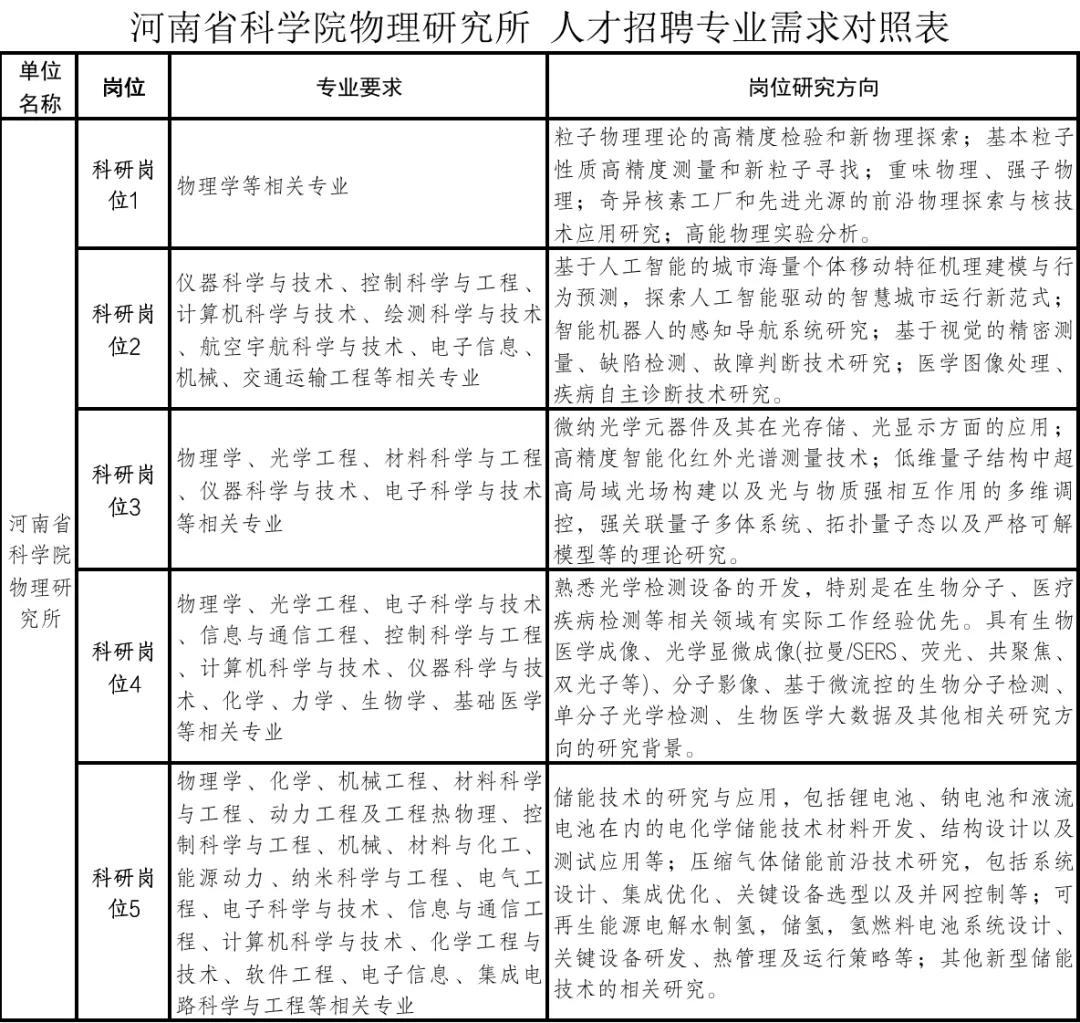 河南省科学院物理研究所人才招聘专业需求